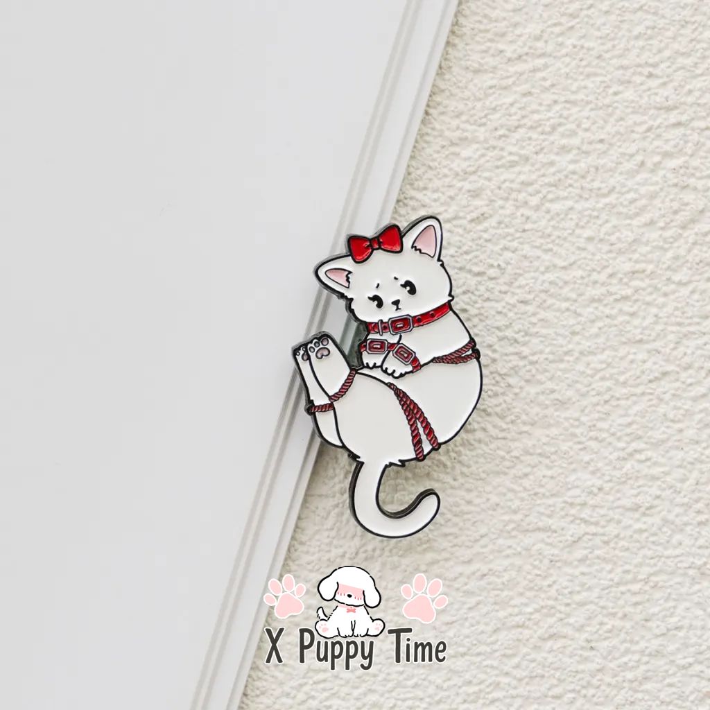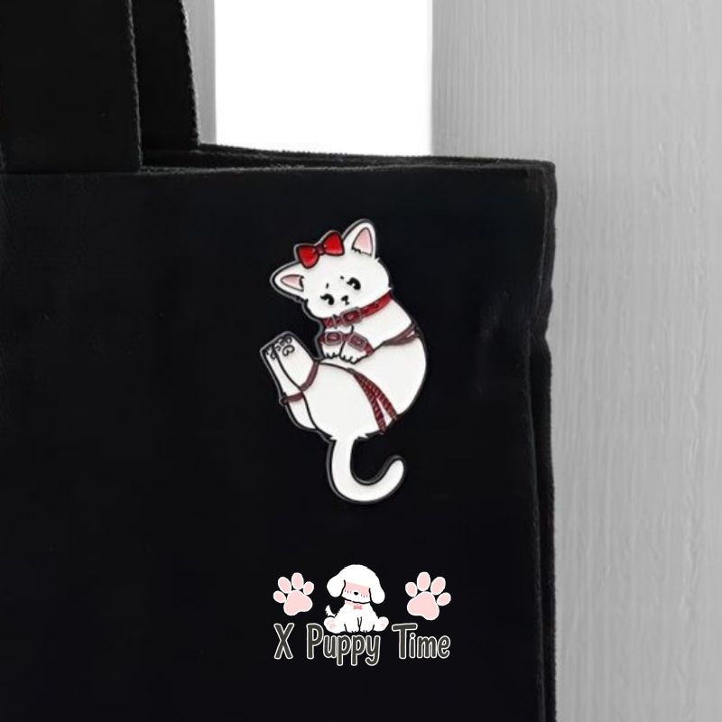The Tied Kitty Enamel Pin from X Puppy Time is equal parts adorable and rebellious. With soft white fur, red ribbons, and a few too many straps, this little cat masters the art of looking guilty and cute at the same time. A playful mix of cute-fetish aesthetics and parody humor, perfect for adding a mischievous twist to your bag, jacket, or pin collection.